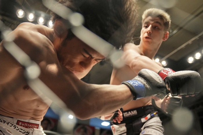 1R、両者オーソドックス。中池がプレッシャーをかけてケージまで下がらせたところでタックルに入りテイクダウン。ガードを取る下田。足を超えてハーフにした中池。