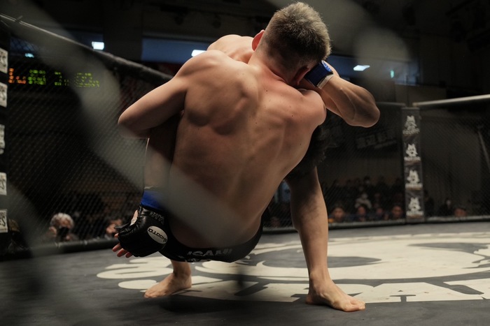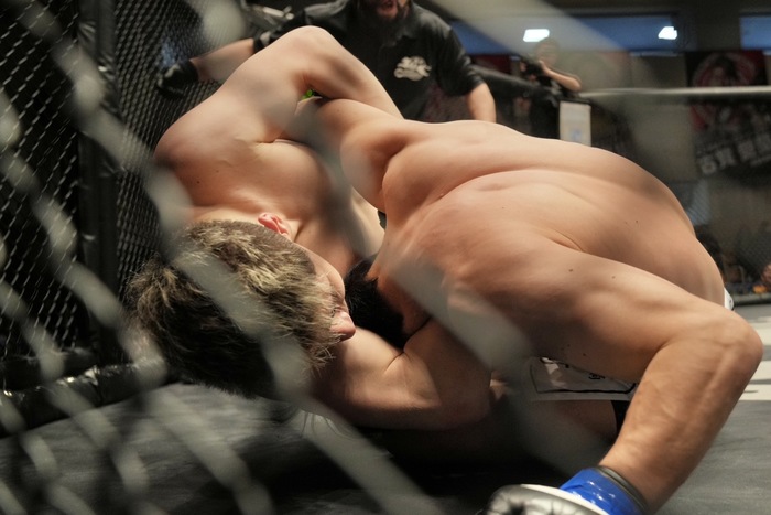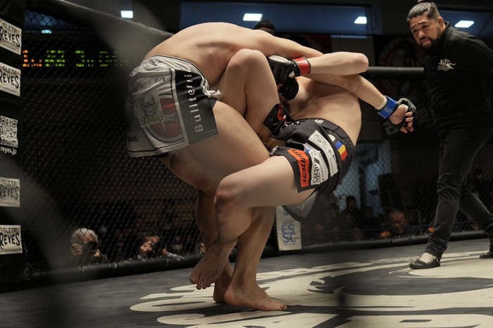 マウントを狙ったところで下田がケージを蹴って返そうとしたが、その瞬間にギロチンに捕らえた中池。立ち上がって振り落とそうとする下田だが、中池放さず。