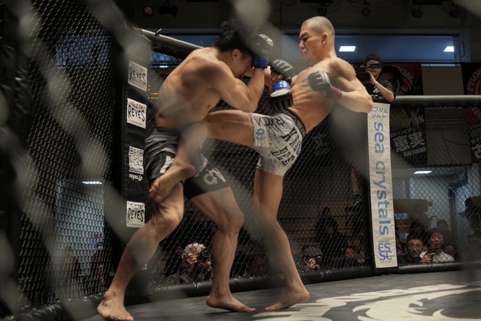 ジャブからテンカオを入れた中野。ケージに詰めてミドルを連打した中野。タイムアップのホーンと同時に中野の左が入り、膝を突く松下。