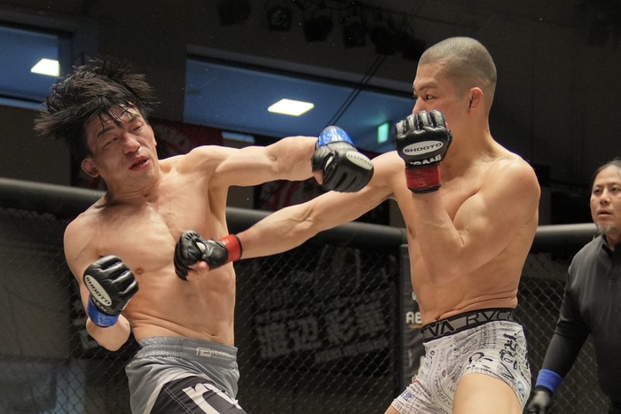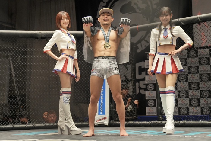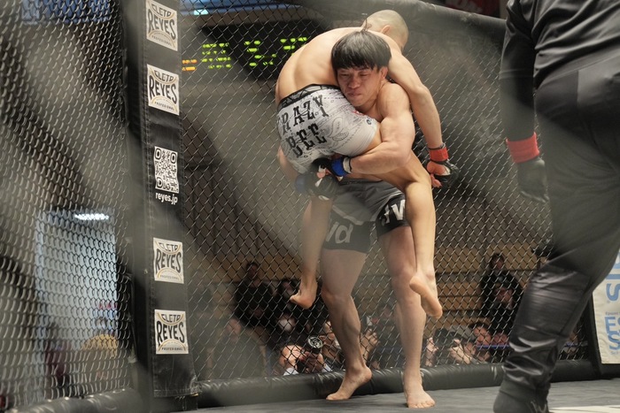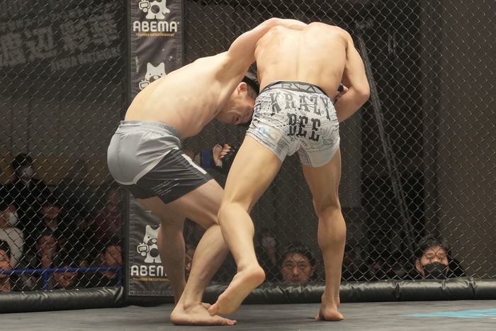 しかし中野はガードから三角に。クラッチするがやや浅い。松下がパウンドで抵抗。解除した中野。松下が上からパウンドを入れる。中野は上半身起こそうとするが、寝かせた松下がパスを狙う。立ち上がる中野。また左を打ち込み腰が落ちた松下だが、すぐタックルに入り立ち上がって凌いだ。1R終了。