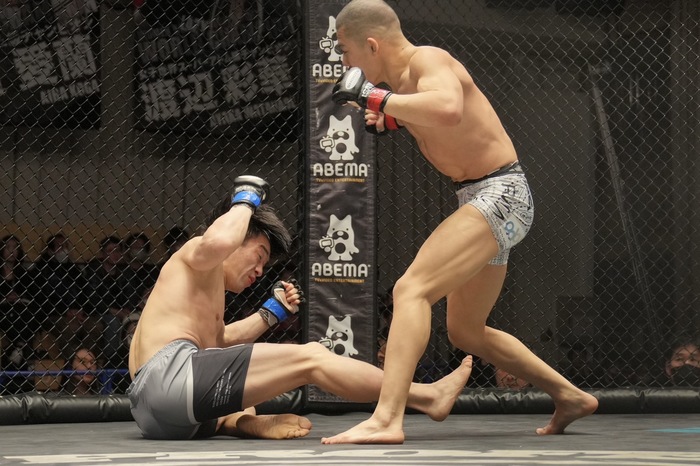 1R、中野はサウスポー。松下はスイッチを繰り返す。中野の左がヒット。また左を打ち込むと、もらった松下が一瞬遅れてダウン! 鉄槌を入れる中野だが、松井は中野の足首にしがみつくとテイクダウン。