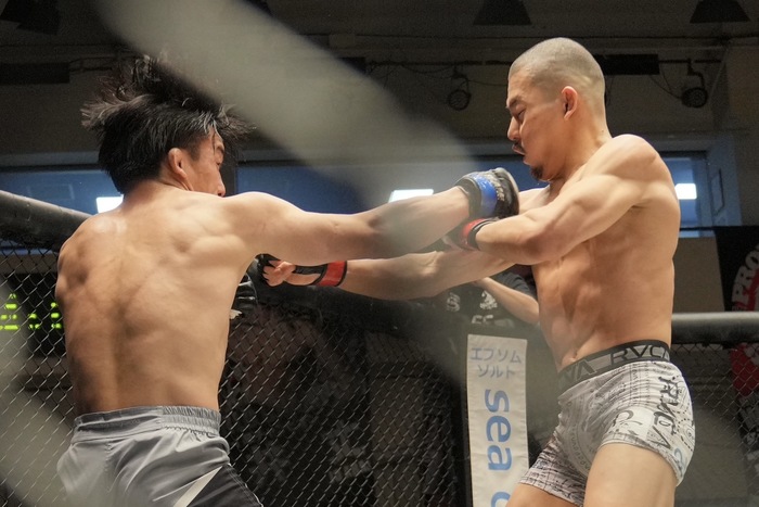 飛び込みを見せる松下に対し、中野はサイドにかわしながらフックを入れていく。逆にケージに詰めた中野。テンカオをヒット。残り1分。松下が詰めていくがサイドステップでかわす中野。