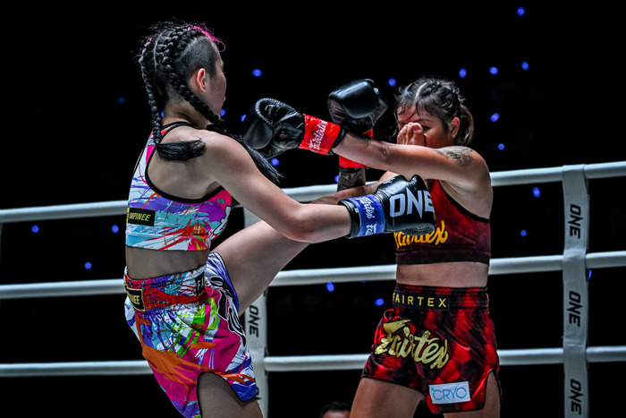2R、冬華の右ローにワンツーを返してきたチーチェンに顔面前蹴りを返す冬華。ワンツーで前に出る冬華が顔面へ前蹴りをヒットさせるが、チーチェンは手数を返してくる。冬華が前蹴りの2連打、左ボディも打つがチーチェンのワンツー、左フックをもらってしまう。