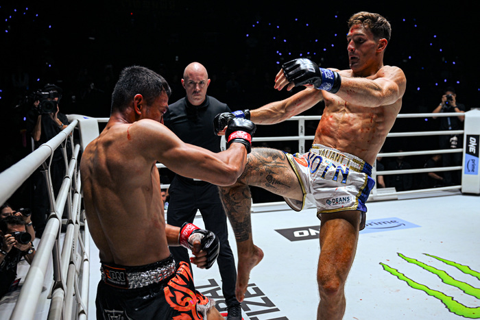 2R、カリロの前蹴りに下がるシッティチャイへカリロは右縦ヒジ。シッティチャイは左ストレートのボディ&顔面で応戦する。カリロの左フックからの右ヒジにシッティチャイも左ヒジ。カリロが左右ヒジの連打、シッティチャイはテンカオ。