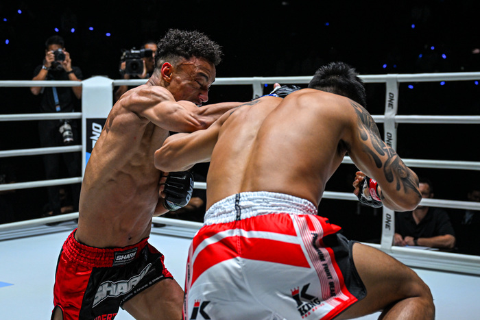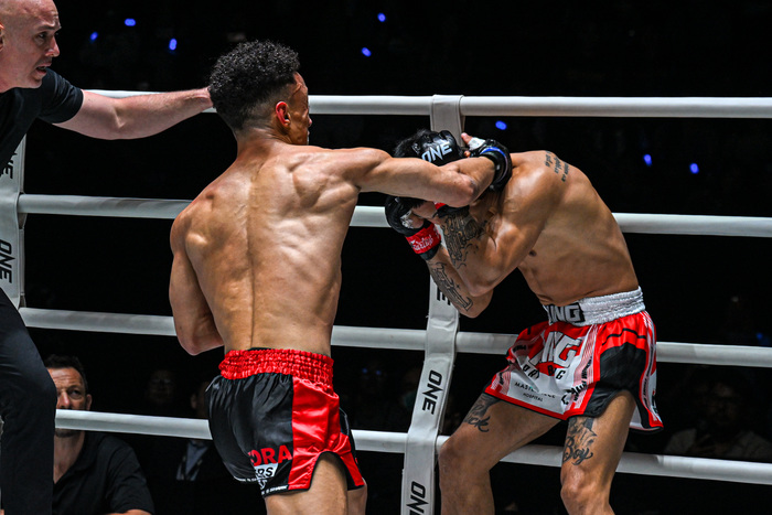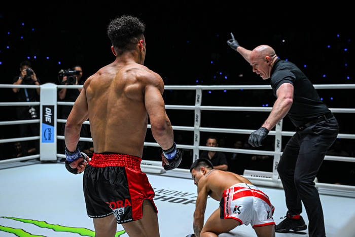 左右フック連打でトンプーンをロープへ釘付けにするジャマリ。トンプーンも打ち合うが、最後はジャマリの左フックがクリーンヒットし、ジャマリが衝撃のKO勝ちでONEデビューを飾った。