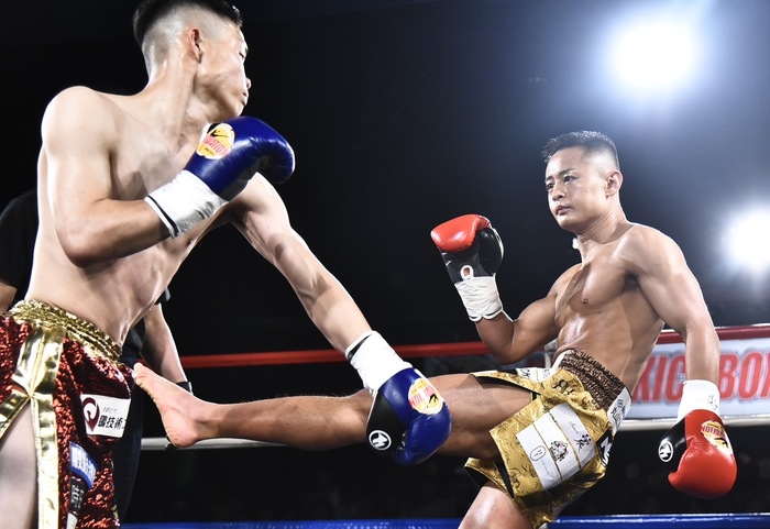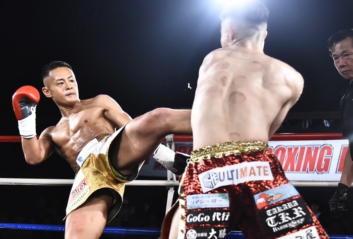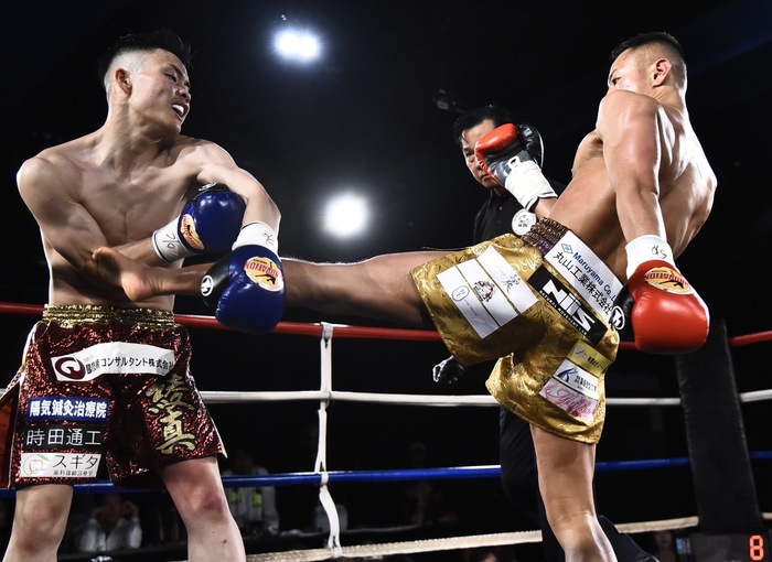 1R、松田はサウスポー。左インローを蹴る松田に吉角は右ミドルと左カーフ。右へ回り込みながら左で蹴っていく松田が強い左ミドル。吉角は蹴りの空振りが続いた。