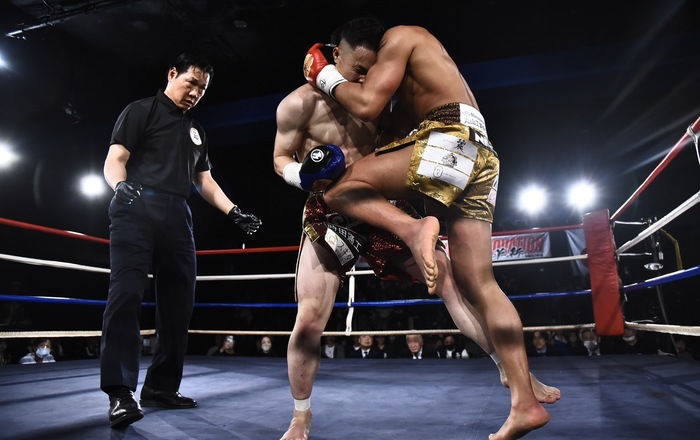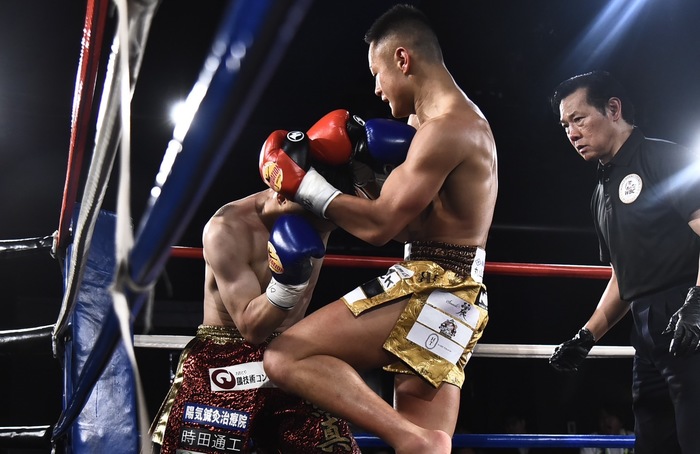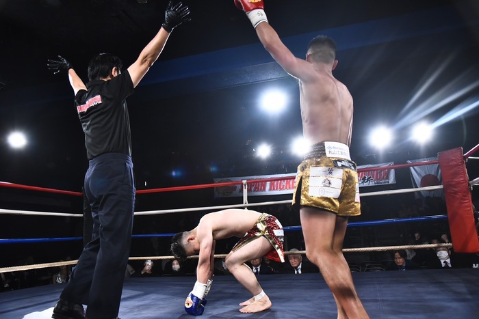 4R、パンチで前へ出る吉角を首相撲からのヒザに捕まえる松田。左三日月2連打に倒れ込む吉角だが、これはスリップ判定。しかし、松田のヒザ蹴り3連打でダウン。再開後も左ヒザでダウンする吉角。最後も松田のヒザ蹴りをもらって吉角が組み付いたところで、吉角のセコンドからタオルが投入された。
