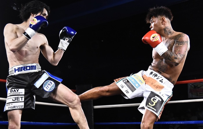 1R、サウスピーの藤田が左で蹴っていくと、Hiromiはいきなりの連打で前へ出る。離れると再び藤田が左ロー&ミドル、左ストレート。左ミドルをフェイントにしての左ストレートも。Hiromiも負けじと右ストレートで前へ出る。互いに相手のストレートを被弾する中、前へ出てワンツーを打って行くHiromiだが藤田に組まれる。