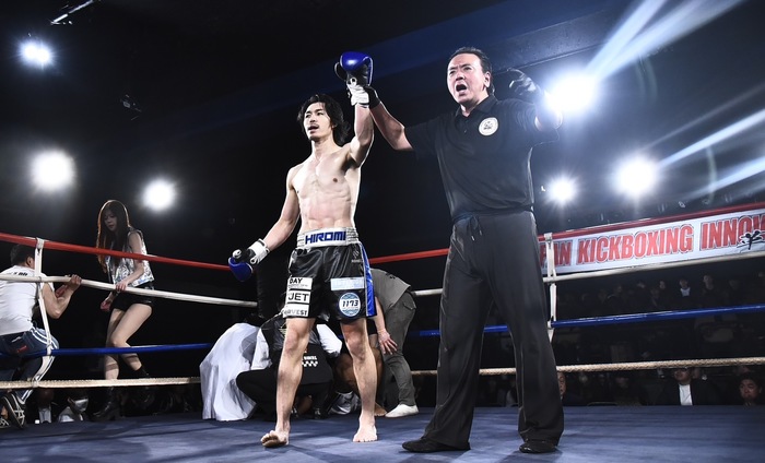 2R、藤田の左ミドルに右ストレートを返すHiromi。これが直撃して藤田はのけ反る。前へ出るHiromiの前足を左ローで蹴る藤田。Hiromiはワンツーから組み付くと右ヒジを藤田の顔面に叩き込む。さらに右ヒジをもう一発、藤田は倒れて起き上がることが出来ず、レフェリーが試合をストップ。