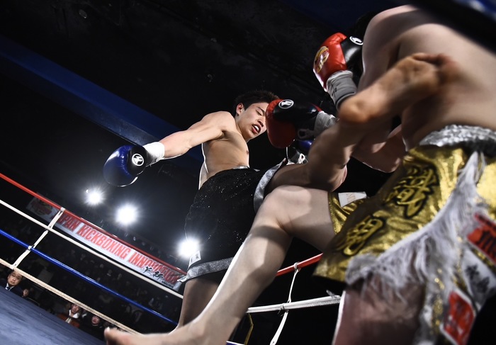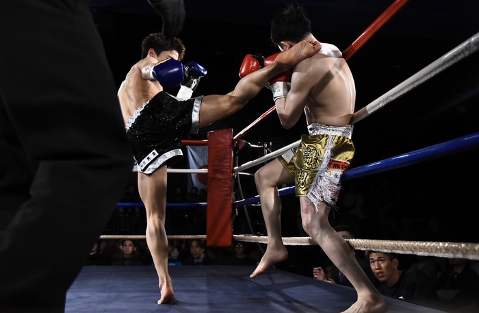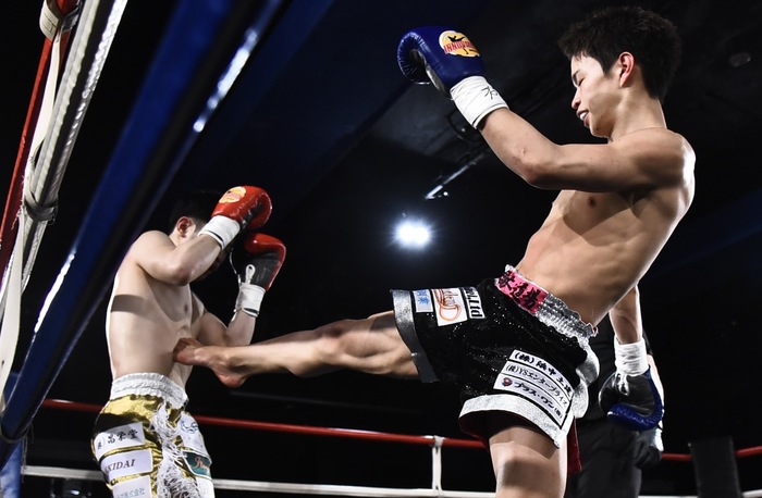 1R、ジャブと右三日月の和田にサウスポーの石井は左右フック。どんどん前へ出て距離を詰める和田は石井の左ミドルをキャッチして軸足を蹴ってコカす。距離を詰めてパンチを打って行く和田に石井は後手となり、蹴り足をとられて転倒。