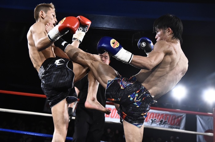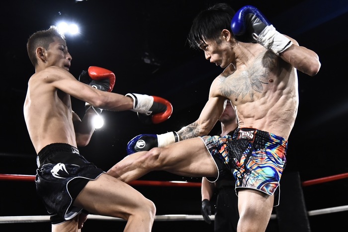 1R、篤志はサウスポー。佐野は右ミドルと右インロー、篤志は左ミドル。篤志の左ミドルに佐野が右フックを合わせる。篤志はワンツーから前蹴りで佐野を押し戻した。