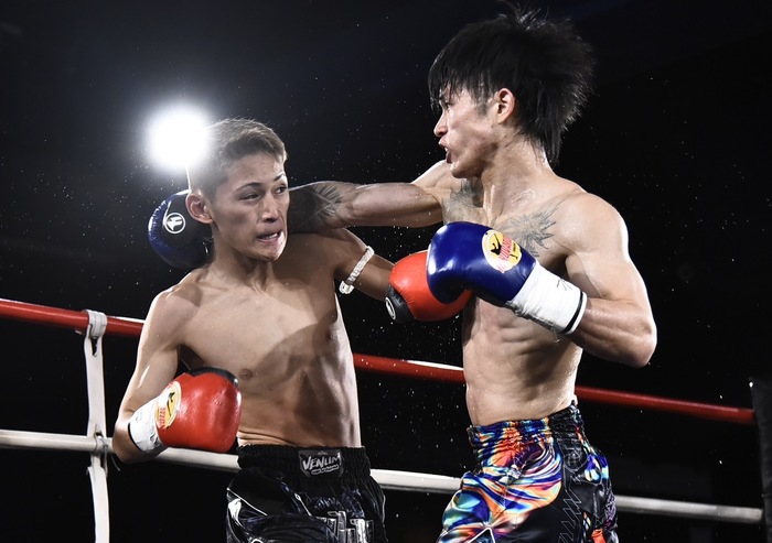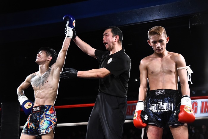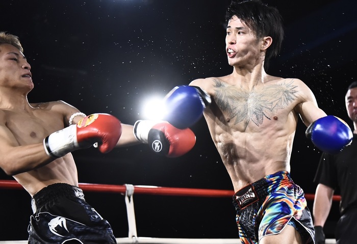 2R、佐野は右ミドル。右ローには篤志が左ストレートを合わせる。右インローを蹴っていく佐野に篤志は左ミドルを蹴り返し、左ストレートで前へ出る。佐野の右ストレートに大きくのけ反る篤志。佐野が追い打ちを掛けようとしたが篤志が組みとフットワークで逃げ切った。オープンスコアは20-19×3で佐野。