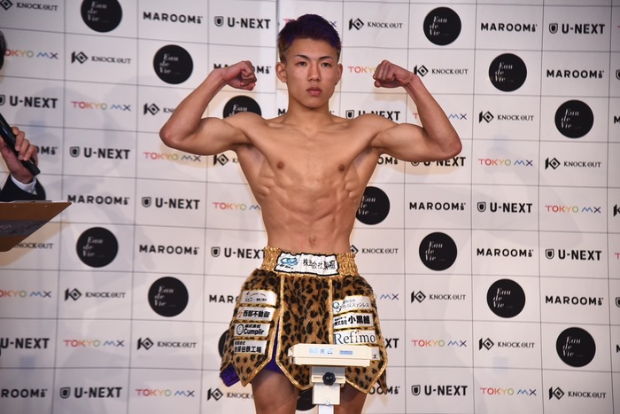 セミファイナルのKNOCK OUT-BLACKスーパーバンタム級3分3R延長1Rで対戦する森岡悠樹(北流会君津ジム)は54.95kg、乙津陸(クロスポイント大泉)は54.85kgでそれぞれ計量をパス。