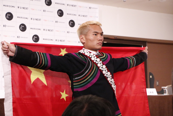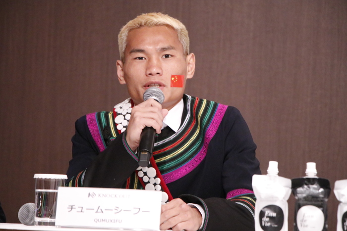 約半年ぶりの参戦となるチュームーシーフーは「ただいまKNOCK OUT! 皆さん、こんにちは、私はチュームーシーフーです。今回、5回目の来日、5回目のKNOCK OUT出場になります。今回も海外の試合ですが、中国で応援してくれる同胞のために、全力で戦いと思います。皆さんにまたエキサイティングな試合をお見せできるように頑張ります。ぜひ応援してください」と元気よく挨拶。