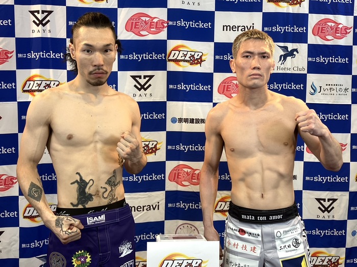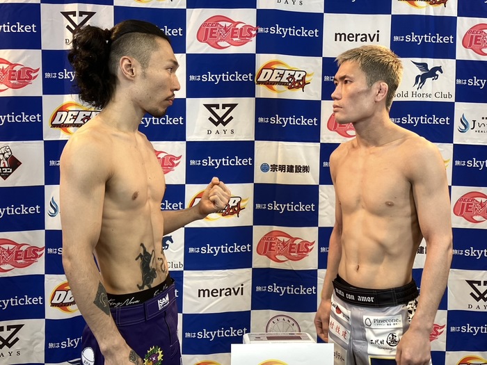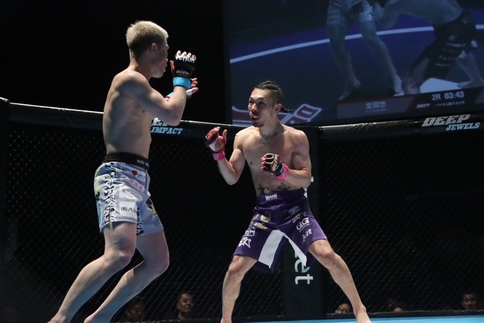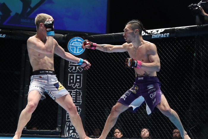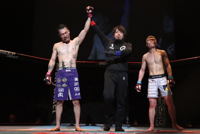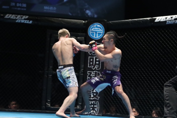 右を突く眞介に、左を返す堂園。左前手フックからの打ち返しにダブルレッグテイクダウンの眞介はハーフから脇腹に細かいパウンドでゴング。判定は2-1に割れるもダウンを奪った堂園が熱戦を制した。