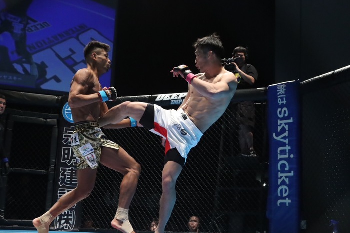 ダウンも立ち上がる瀧口は右で差して押し込み。シングルレッグでテイクダウンもバッティングでケンヤスキーにドクターチェック中断。