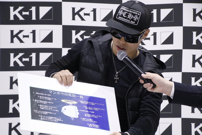 するとここで永坂はフリップを取り出して、最弱の生物としてマンボウを紹介し、大久保はマンボーのようなものだとする。その証拠は「とある筋から調べた。一番のファンだからやってるんだぞ」と、大久保の弱点を調べて紹介。最後には「永坂が一番の天敵」だとし、「あいつは女の子にやっているように抱き着いてコカしてダーティーな試合をする。俺はフィジカルでゴリゴリやるし、一発で相手を沈めてやるから」と宣言した。