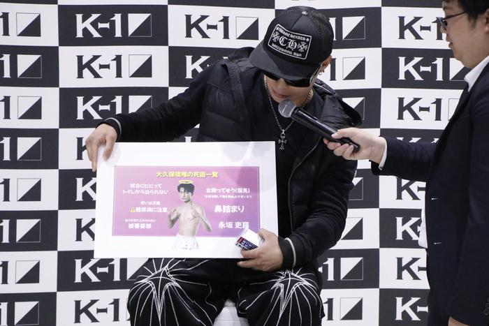 宮田充K-1プロデューサーは会見で「大久保選手が55kg、永坂選手が57.5kgだが契約体重56kgで合意に至った。永坂選手はいいヤツだったのに、悪いヤツとつるむと悪くなる、友だちに影響される。いろいろな方面に喧嘩していて、そこはやめた方がいい。ほどほどにして欲しいと卜部会長経由で小言を言っても変わらない。開き直っている。一皮剥けるどころかずる剥けという感じがある。そこまで大久保と言うのなら、どれだけのものを見せられるか。大久保選手には正義として制裁を与えて欲しい」と、永坂に苦言を呈した。