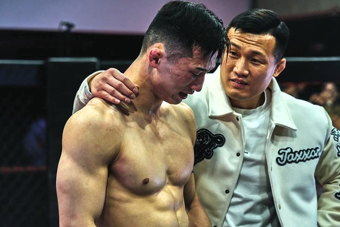 愛弟子のジャン・ユンソンのTKO勝ちに、師匠ジョン・チャンソンは肩を抱いて労った。