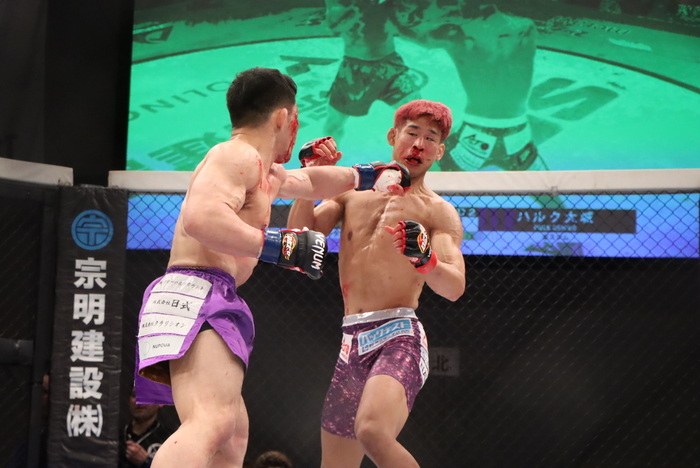 1R、左ジャブ&右カーフの中島は大城の左足脛をカットさせる。左ジャブを上下に突く中島に右を振る大城は、左のスーパーマンパンチで中島も鼻血も、中島は大城の入りに右ボディから左フック、右ハイ、ジャブのダブル、右三日月蹴り。右ストレートを当てて大城をグラつかせて詰めるがゴング。