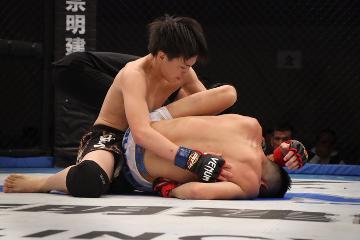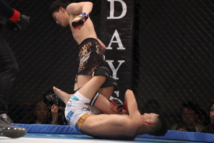 1R、北見の2度の組みを切ったサウスポー構えの小林。マウントからパウンドで、北見の下からの足関節狙いに正座してヒザを曲げてパウンド。レフェリーが間に入った。