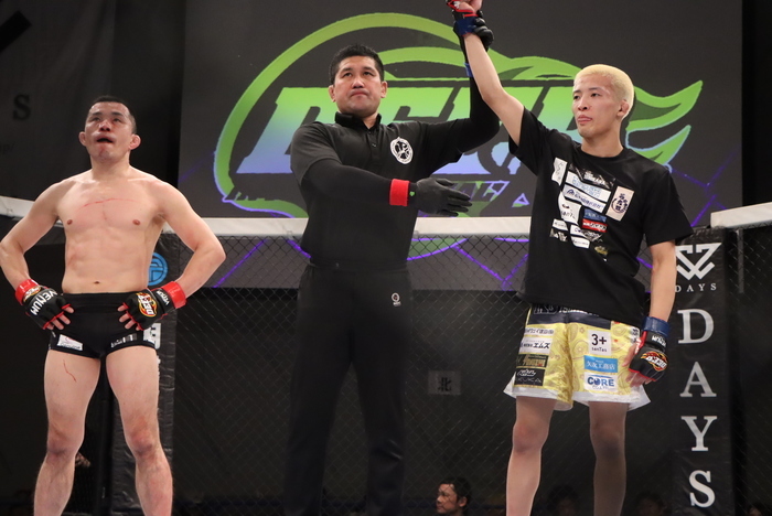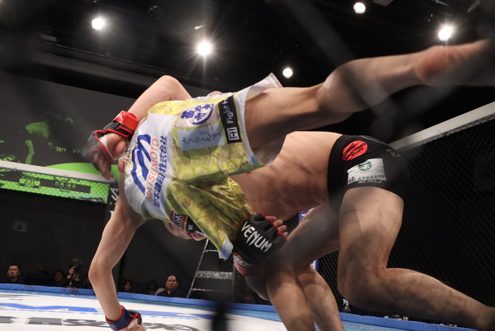 2R、左の蹴りを上下に突く神酒に、齋藤はダブルレッグで崩すも片手を着いて残す神酒。離れて齋藤は右ヒザをヒット! さらに右を突く。しかしアイポークに中断。神酒の回復待ち。再開。