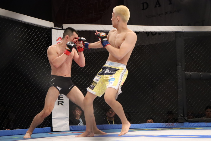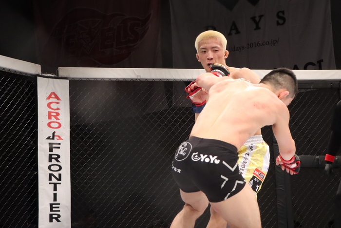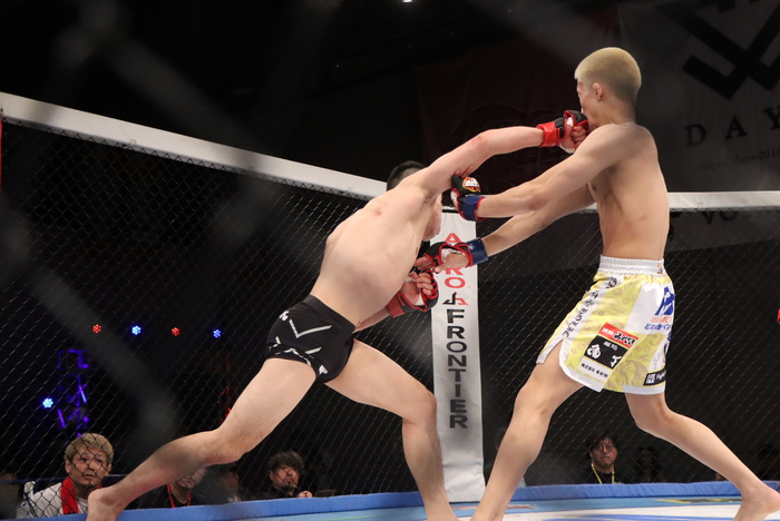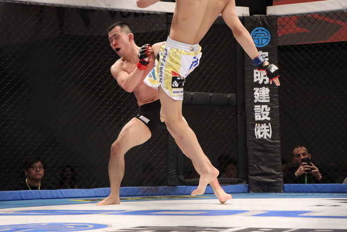 神酒のニータップを2度切る齋藤は、右の入りに左を当て、右ヒザ。神酒は右オーバーハンド、インローを返すが、ケージ背にする展開に。
