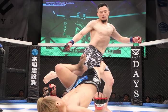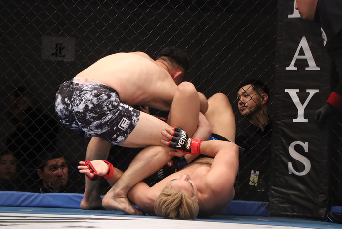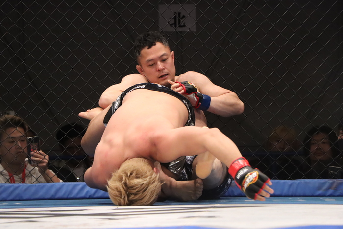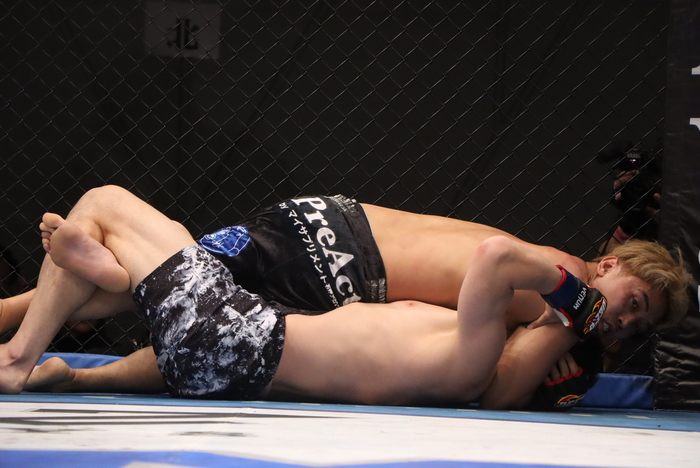 1R、高鍋の蹴りに佐々木はイマナリロール狙い。シッティングガードで近づくもブレーク。右の蹴りを当てる高鍋に佐々木は引き込み。インサイドガードに入る高鍋は。佐々木は下からオモプラッタ、腕を抜く高鍋に外掛けサドルロックでヒール狙いも、足抜く高鍋にトランジッションでトップに。ハーフから押さえ込みゴング。