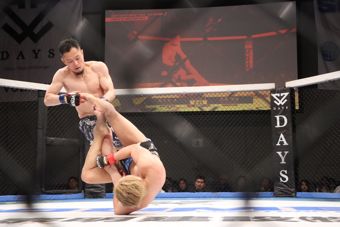 2Rも先に滑りこんで下を選択する佐々木。上から右の蹴りを放つ高鍋に佐々木は足を掴んで倒して外ヒールを極めた。
