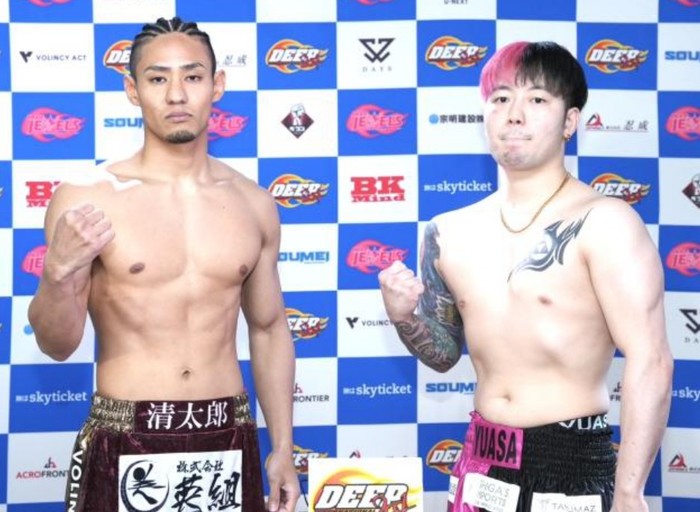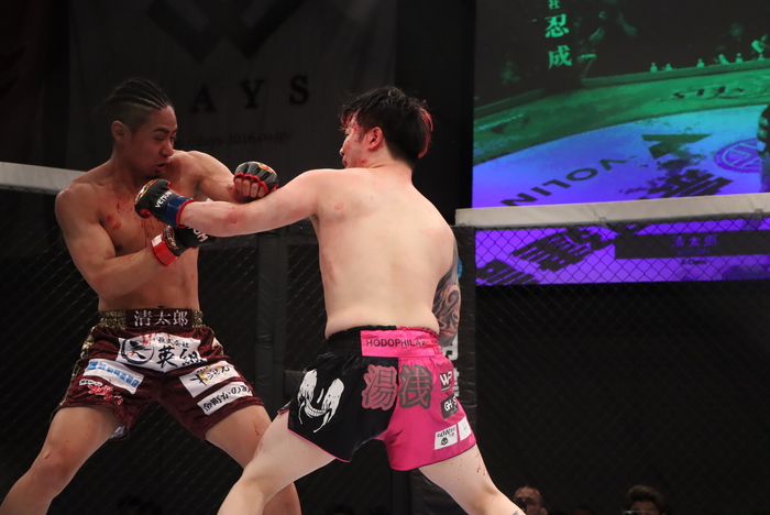 大きな左右振る湯浅に右クロスを狙う清太郎、湯浅はセンチャンキックで下になるも立ち上がり右を当てて前に。清太郎はクリンチ。