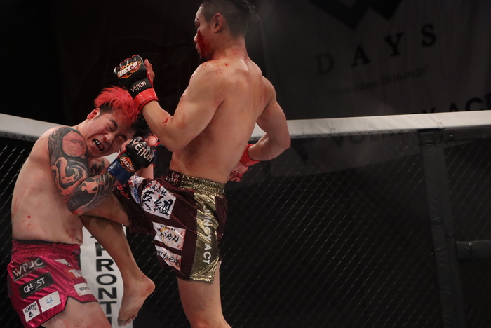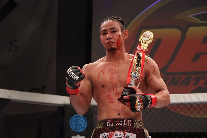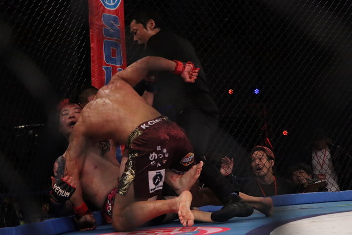 1R、スイッチする清太郎の首相撲ヒザに一本背負いで投げる湯浅だが、バックに付く清太郎はリアネイキドチョーク狙い。腰をずらし体を入れ替え上になった湯浅はパウンド。清太郎が左目上から出血でドクターチェック後、再開。
