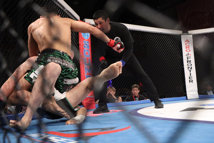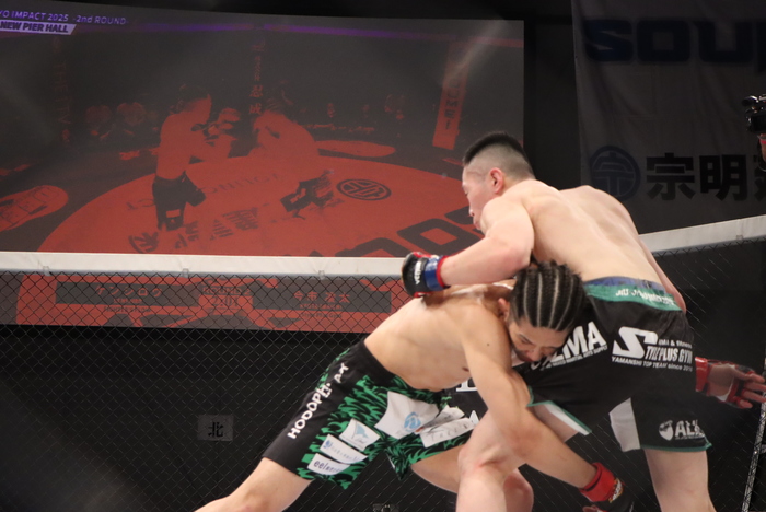 2R、左を振って組んでボディロックテイクダウンのケンシロウがバック奪うが、踵がローブローとなり、スタンド再開。ダブルレッグから金網までドライブし、四つから小外刈テイクダウンのケンシロウ。マウントからパウンドでレフェリーが間に入った。
