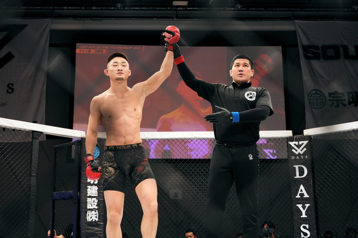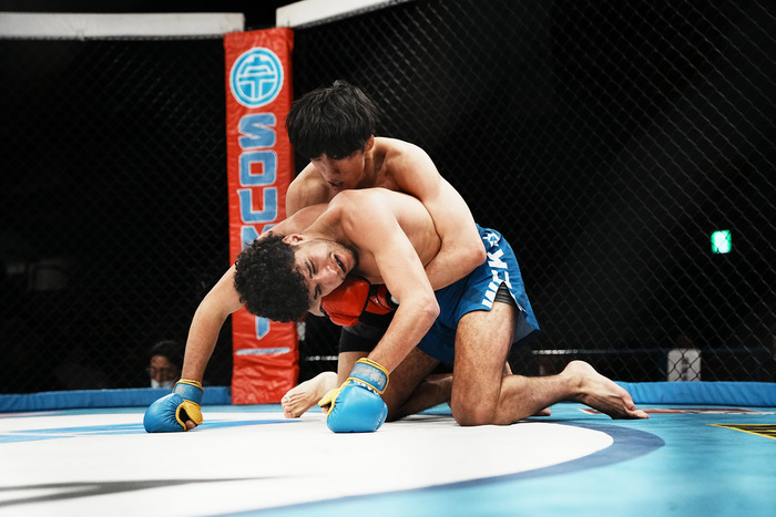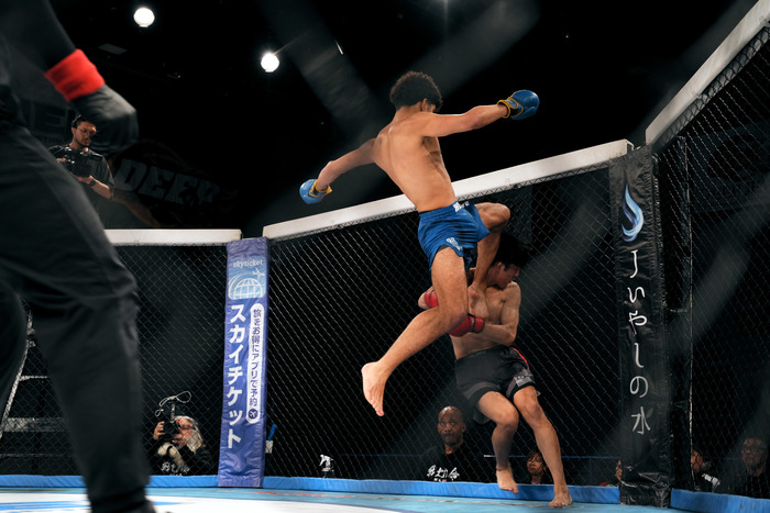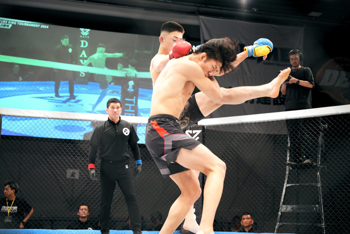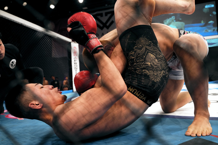 1R、サウスポーの杉野はいきなりの飛びヒザ蹴り、かわした有馬が右ミドル。有馬はステップで細かく動き、蹴りを放って行く。杉野が飛びヒザから、組んできた有馬の首をとってギロチンの体勢に。両足を組みなおしてさらに絞めあげた杉野に有馬はタップ。杉野が準決勝に続いてギロチンで見事な一本勝ちを収めた。