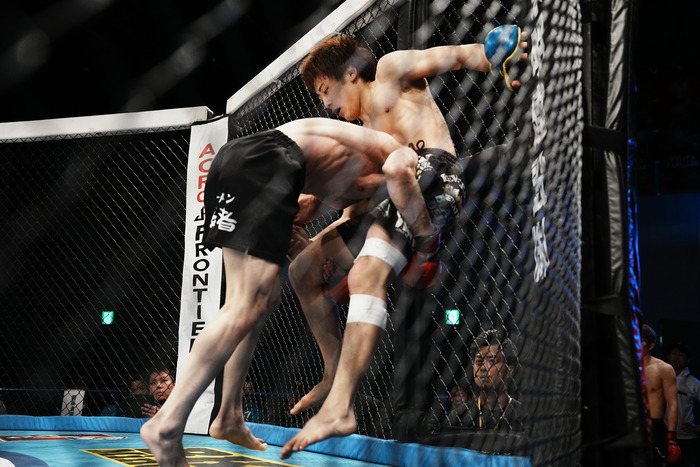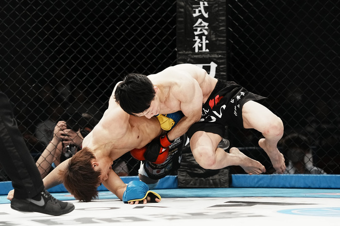 2R、右ストレート、右アッパーで前へ出る横山を菊地がダブルレッグでテイクダウン。立ち上がる横山だがすぐに菊地が組み付く。バックを奪った菊地が投げるようにしてテイクダウン。横山は首に腕を巻くが抜かれ、パウンドを浴びる。