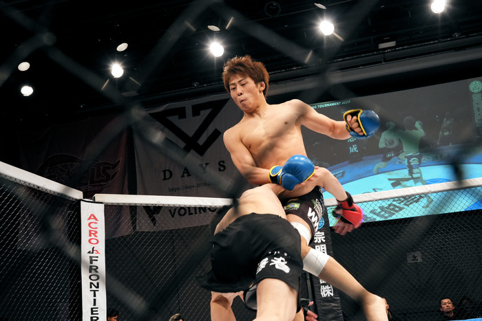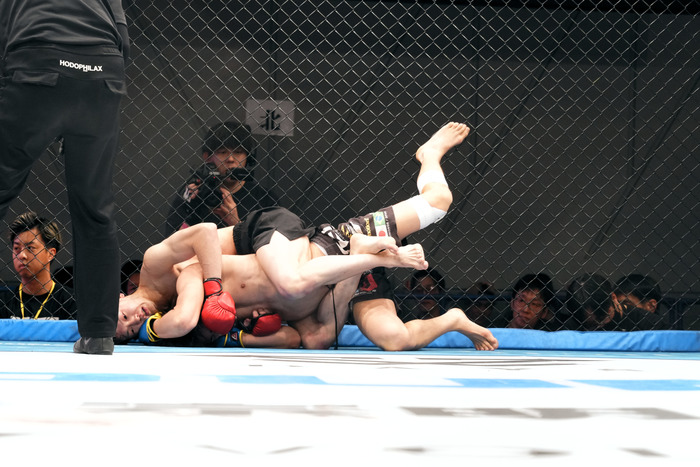 1R、右カーフから左右フックの横山に菊地がシングルレッグからボディロック。離れると菊地のダブルレッグに横山がヒザを合わせに行ったがそのまま菊地がテイクダウン。横山がギロチンに捕らえるが首を抜く。