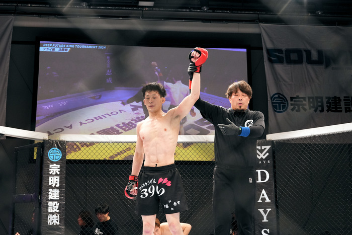 立ち上がる横山へすぐにダブルレッグで組み付く菊地。バックマウントから左でパウンドを見舞っていき、横山をエビ反りにしてリアネイキドチョークをしっかり極めた。