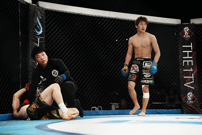 ボディへパンチを見舞っていく菊地は立とうとする横山を許さない。細かくパウンドを打って上をキープする菊地は左フックを強く打つ。そのまま1Rが終了した。