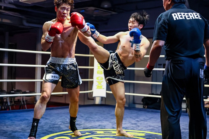 1R、お互いにローを蹴り合う中、パンチで前に出る斎藤に、サンギュは右ローをこつこつ当てる。終了間際に、サンギュはカウンターの右ストレートをクリーンヒットさせて連打につなげる。