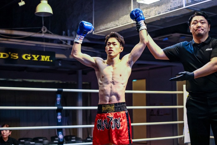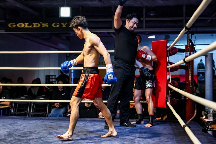 1R、ゴングと同時に一気にラッシュを仕掛けた有賀が佐野をコーナーに詰めてダウンを奪う。再開するも、有賀が佐野を防戦一方に追い込んだところで、レフェリーがストップした。
