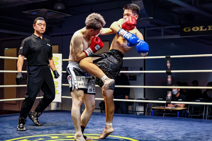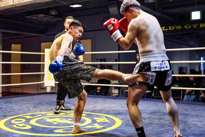 1R、プレスをかける大高に、清水はパンチを散らしながら右ロー。左ジャブ、右フック、右ロー、テンカオと次々に攻撃を当てる清水は、右ローの集中打で大高の動きを止める。
