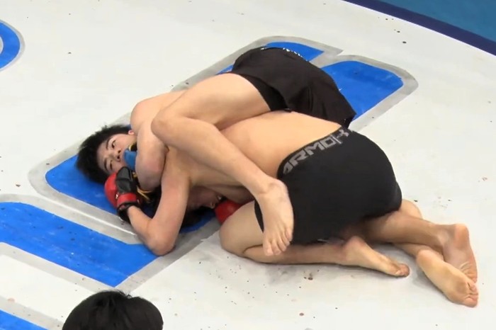 前転する田村についていくが田村も正対しすると互いに立ち上がり。田村のワンツーをかわした須田がボディロックテイクダウン。すぐにたすきから両足をかけて背後からパウンド。亀になって落とそうとする田村に、シングルバックから右手を喉下に入れるが、ここは田村が横に落としてトップに。
