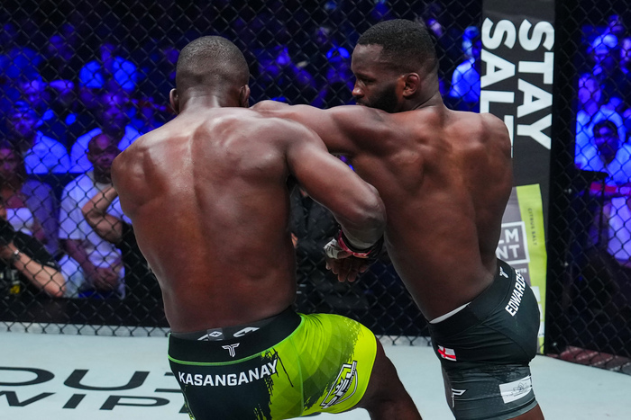 左前蹴りを腹に突くエドワーズ。カサンガネイの左右連打に、エドワーズは下がりながらも左ヒジ!