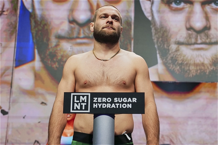 2R、先に上下に突いたウィルソンがダブルレッグテイクダウン。下から左で差してくるバーネルに、ウィルソンはトップからギロチン狙いで再び背中を着かせると、右で小手巻きから左ヒジ! ラウンドの大半をコントロール、パウンドする。