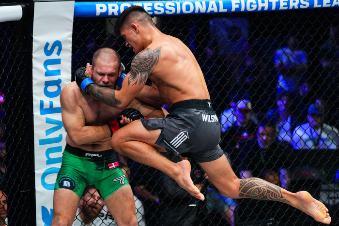 ケージに押し込むバーネルは両差しにて小外も、残したウィルソンが右を当てて、左右ラッシュ。さらに右前蹴りを腹に。クリンチで前に出たバーネルに体を入れ替え跳びヒザ、ダブルレッグテイクダウンはウィルソン! パスガードでサイド、ニーインでニアマウントに。トップからヒジを突きゴング。