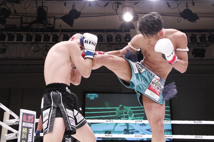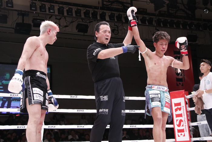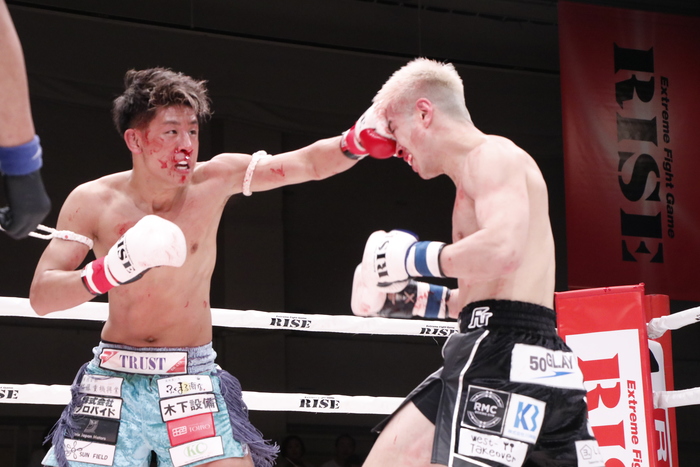 3Rになると両者距離を詰めて左右フック、ヒザ、右カーフの打ち合いに。ノーガードで久津輪のパンチを被弾する戸井田は右フックでダウン寸前となるが倒れることなく鼻血を出しながら打ち合う。至近距離での打ち合いは最後まで続いた。