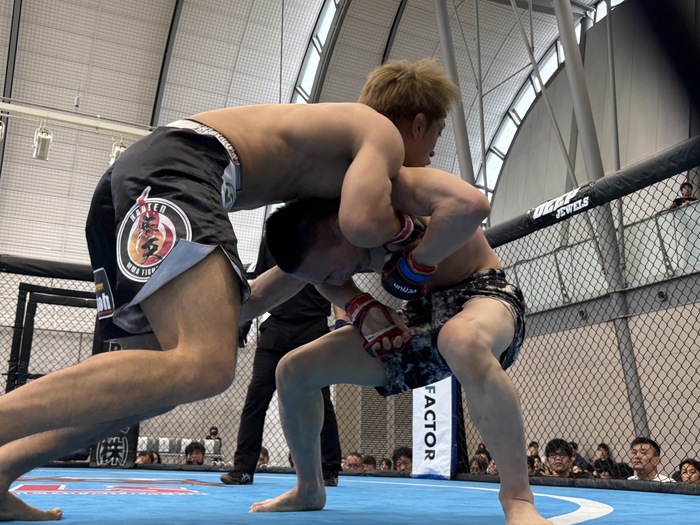 2R、左ローの山田。右スーパーマンパンチも軸がぶれる。詰める髙村は山田の組みをがぶり潰してバッククリンチから左ヒザ。「友晴」コールのなか、髙村はボディロックテイクダウン。