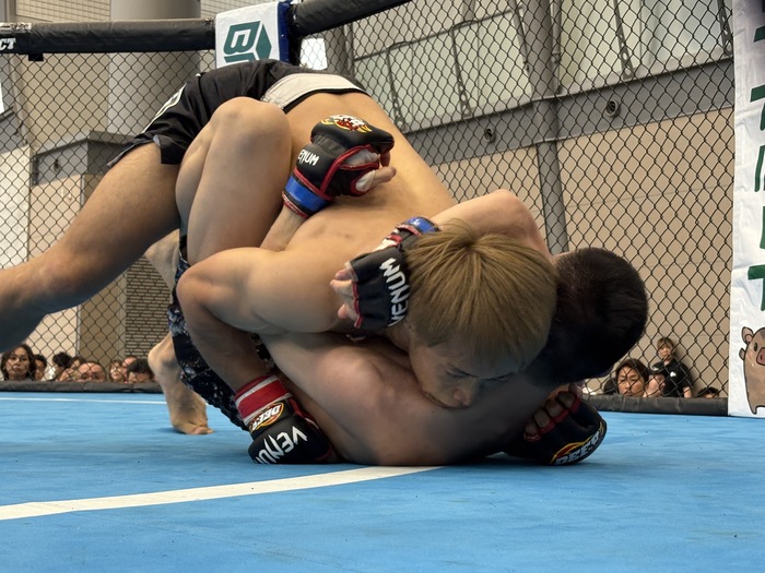左差しでリバーサルする山田をすぐに入れ替えてトップに戻した髙村は、サイドから腕十字狙いもその際で山田がトップ狙いに。際で腕を狙いながらすぐに立つ髙村がニータップでテイクダウン! ハーフからパウンド狙いも山田も手首を掴みゴング。
