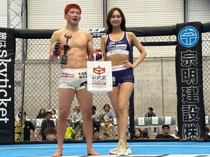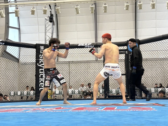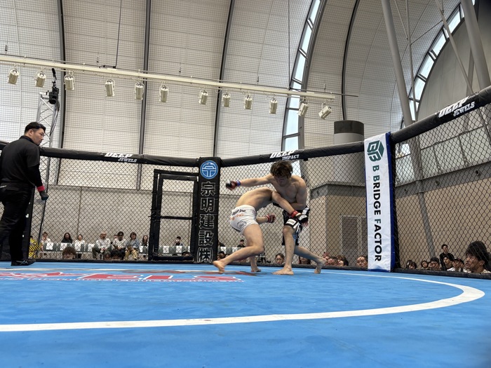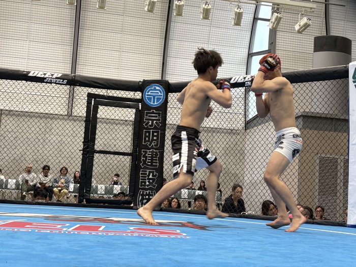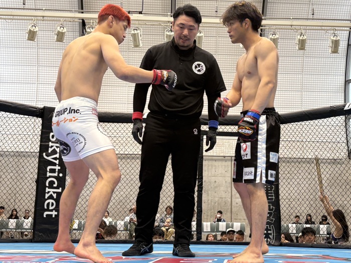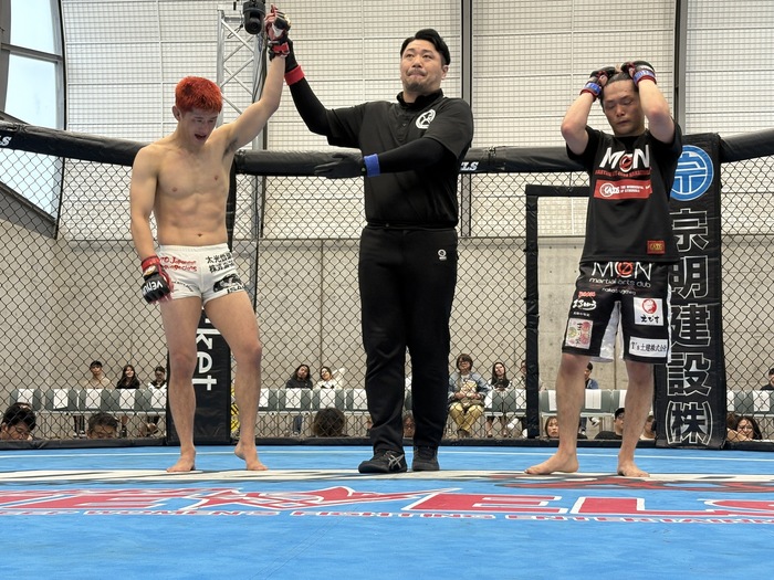 判定は終盤にポジションを譲ったものの、要所でテイクダウン、攻勢に立った中西がマスト判定3者19-19で勝利した。