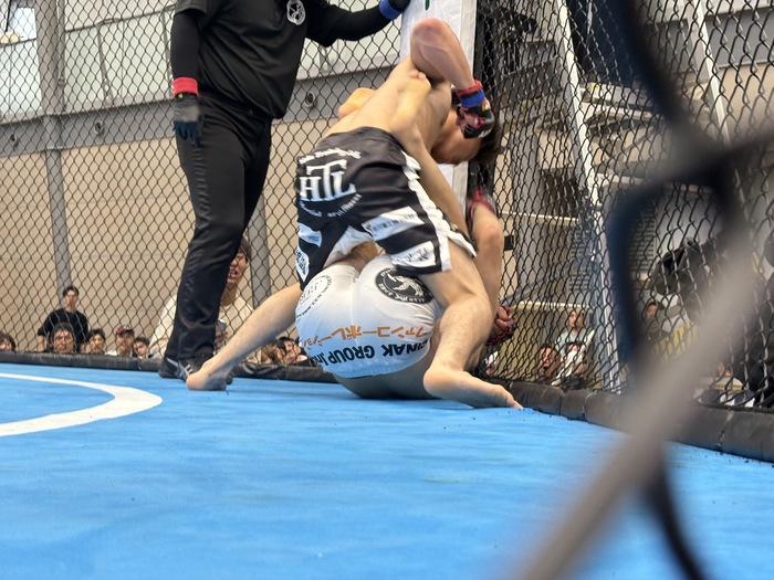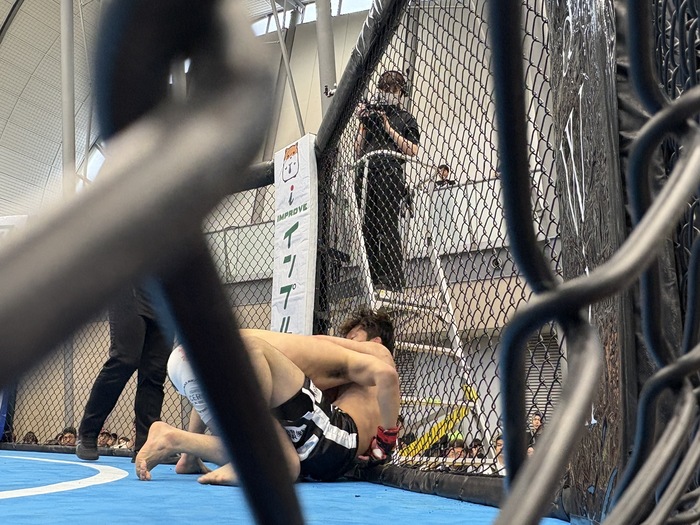 足を抜く廣瀬は再び尻を引き、ケージ背に立ち上がり。そこにボディロックテイクダウンの中西。すぐに立つ廣瀬に、後転スクランブルする中西だが、際で上は廣瀬。トップからパウンド連打の場面を作ってゴング。