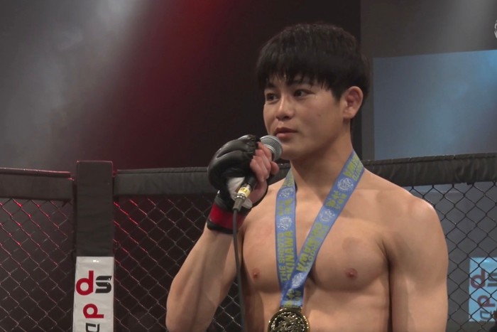 鮮烈のヒザ蹴りを決めた青井は、「心技館の青井心二です。今回このような素晴らしい沖縄大会に呼んでいただいた沖縄修斗の関係者の皆様、本当にありがとうございます。そしていつも遠征ばっかりなんですけど、ついてきてくれる遠藤代表、先生、師匠、本当にありがとうございます。そして練習仲間の皆さん、本当にありがとうございます。まだまだ大きいことを言える立場じゃないんで、もっともっと練習いっぱいして、どんどん試合したいです。沖縄の人に少しでも自分を知ってもらえたら嬉しいです。ありがとうございました」と語った。